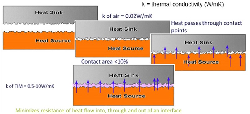 Les matériaux d’interface thermique visent à assurer un contact thermique homogène entre deux surfaces adjacentes, généralement entre un composant et son dissipateur. Par le passé, les concepteurs faisaient souvent appel à des ventilateurs, des dissipateurs, ou les deux, comme solution universelle de refroidissement. Cela s'expliquait par le fait que la majeure partie de la chaleur était générée par des alimentations ou CPU massifs, suffisamment grands pour accueillir ces solutions. Aujourd’hui, même lorsque le flux d’air forcé est présent, la dissipation rapide de la chaleur entre un composant chaud et le dissipateur reste un défi. Les TIM comblent les interstices entre surfaces usinées, assurant un contact efficace et une haute conductivité thermique. Cela est également valable lorsque le boîtier lui-même fait office de dissipateur.
