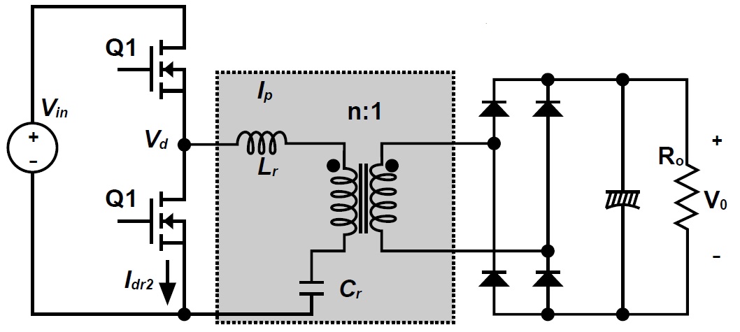 Ce type de conversion minimise les pertes, qui peuvent être quasi nulles dans des conditions idéales, en particulier avec des MOSFETs en carbure de silicium (SiC). Le rapport cyclique est constant (50 %), mais la fréquence de commutation varie selon l’ajustement nécessaire de la tension de sortie.