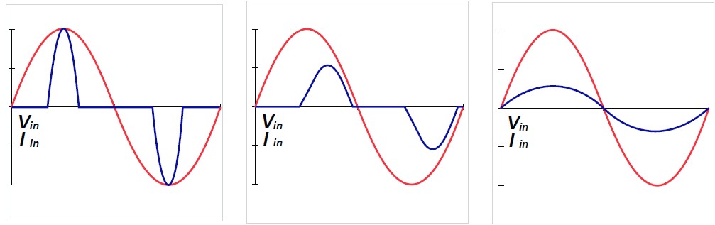 Figures 5-7. Courant d’entrée sans PFC (G), avec PFC passive (M) et PFC active (D)