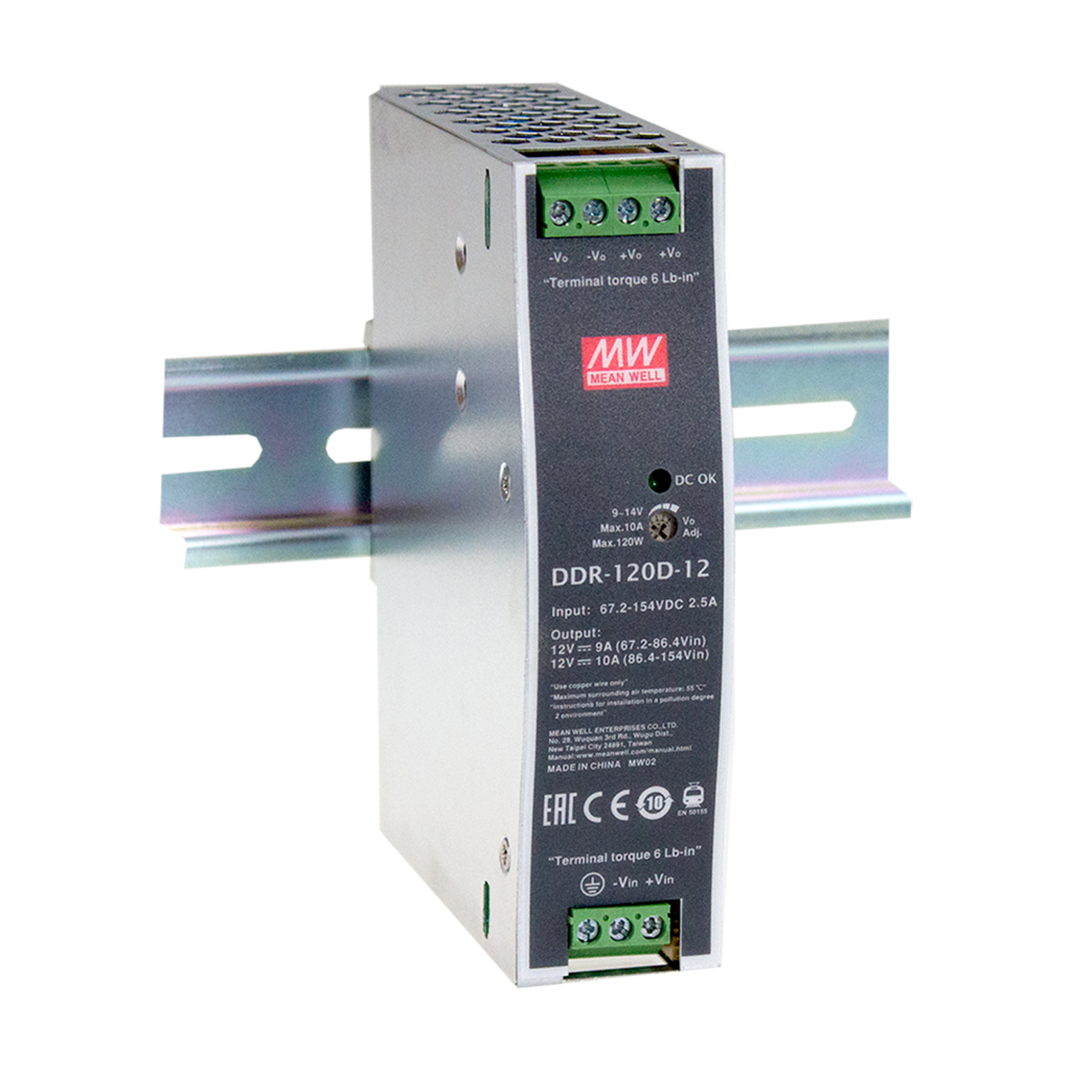 DC-DC Ultra slim Industrial DIN rail converter; Input 16.8-33.6Vdc; Single Output 12Vdc at 10A