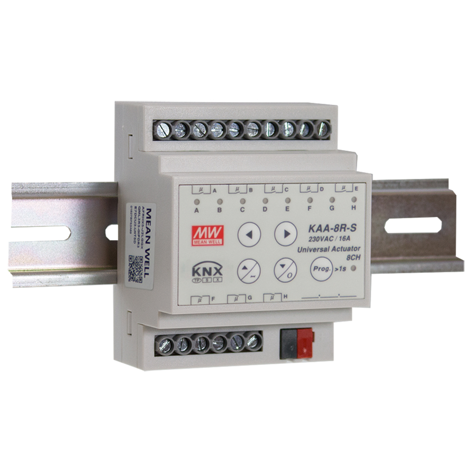 KNX Universal 8 channel Actuator; 10A switching capability per channel; suitable for resistive, capacitive and inductive loads (eg. LED, blinds, motors, etc.); built-in KNX Data Secure function